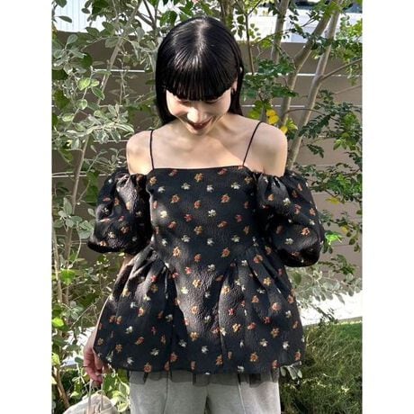 毎シーズン高い人気を誇るペプラムビスチェが、ディテールをアップデートして今季も登場。胸元は切り替えを無くし、すっきりと大人っぽい印象に。ペプラム部分にはチュールを挟み込み、裾からふわりと覗くチュールが儚くロマンティックなムードを演出します。花柄と無地の2タイプ展開で、スタイリングに合わせて選べるのも嬉しいポイント。付属のリボンはボタンで簡単に取り外しでき、パフスリーブ・オフショルダー・キャミソールの3WAYでアレンジ自在。コーディネートの幅がぐっと広がる主役級の一枚です。