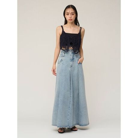 リラクシーな雰囲気を醸すロング丈でトレンド感をプラスしたデニムスカートです。腰回りはすっきりとしたタイトめのシルエットで、太もも位置からタックによりバサっとしたフレアシルエットになるように仕上げました。ハイウエスト仕様で、美シルエットに着ていただける1枚です。ベルトループを2段にしているので、お好みの高さでベルトを付けてアレンジいただけます。カジュアルな5ポケット仕様。トレンド感のあるロープビスチェ(SWFB261191)合わせもおすすめ。
