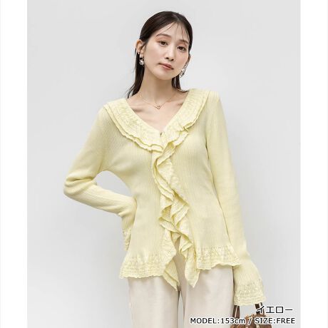 レース調の柄編みがフェミニンなムードたっぷりなラッフルデザインのカーディガン。
