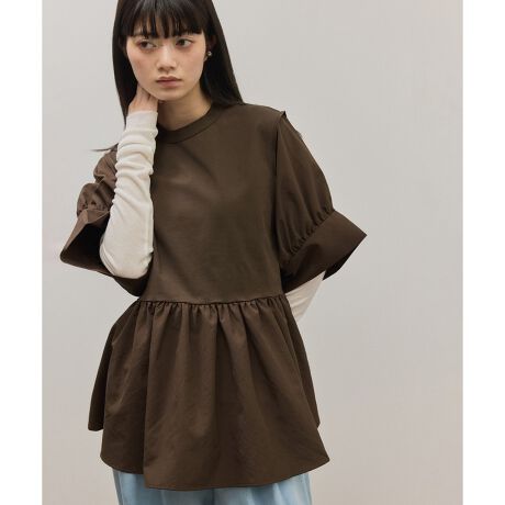 シャツテールカット風のペプラム仕様や、つんと跳ねた袖のカフスによるボリューム袖がデザインポイント。