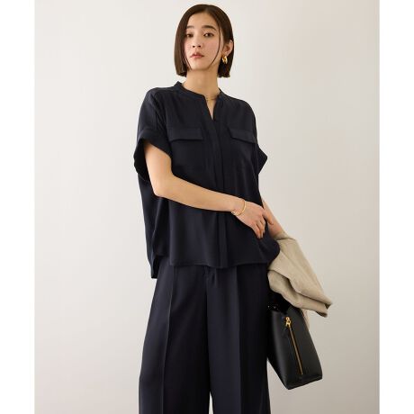 洗練された印象を演出する、スタンドカラードルマンブラウス。