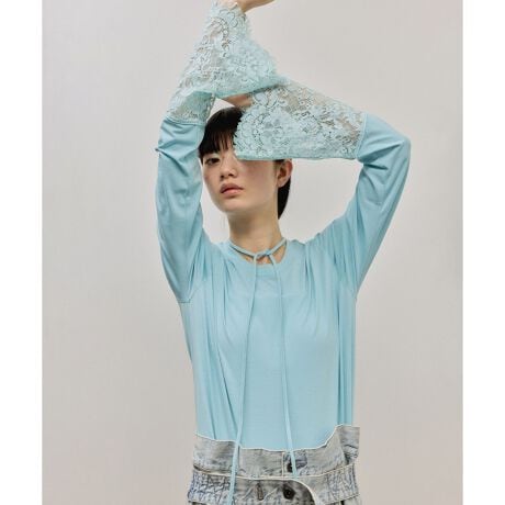 レース生地で作製したカフスがポイントのロングスリーブTシャツ。