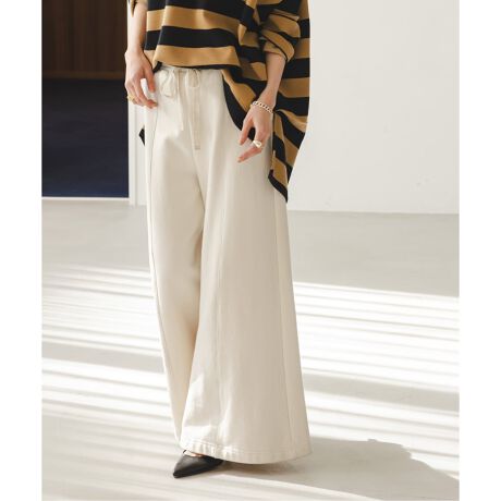 切り替えをフロントとサイドに入れ、台形のように広がるワイドシルエットがポイント。
