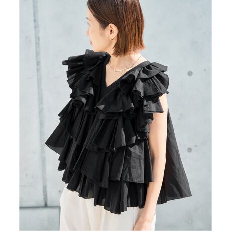 幾重にも重なるラッフルが華やぐブラウス 。
