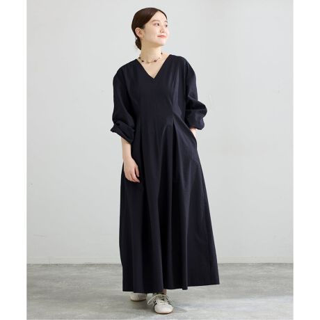 凹凸のあるサッカー素材を使用した、肌離れの良いVネックワンピース。