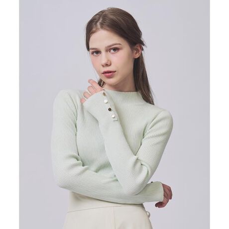 金ボタン付きモックネックリブニット