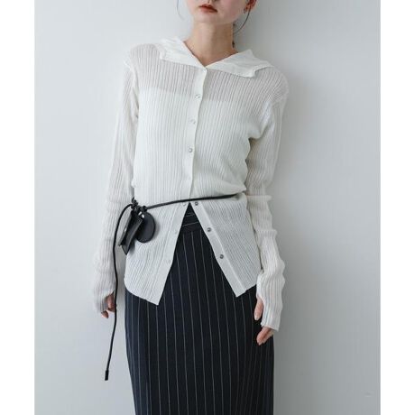 表情豊かなマルチリブ編みが目を惹く、フーディータイプのニットカーディガンです。清涼感のあるシャリっとした質感の糸を使用しているため、季節の変わり目にも重宝する軽やかな肌触りが魅力。最大のポイントは、ウエスト部分に施されたタックデザイン。きゅっと絞られたラインが、リラックス感のあるフーディーに女性らしいメリハリを与え、一枚でスタイルアップを叶えてくれます。前を閉じてプルオーバーのように着こなすのはもちろん、羽織りとしても装いを品よくクラスアップさせてくれる実力派の一着です。