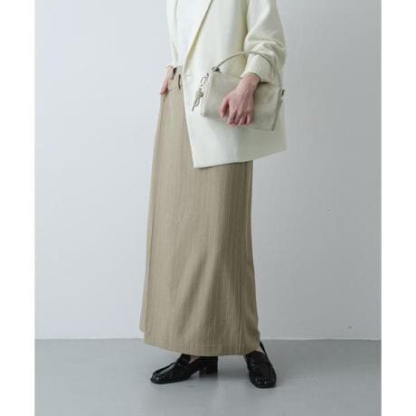 知的な印象を与えるピンストライプを、モダンなカットで仕上げたナロースカートです。シワになりにくく扱いやすいストライプ生地を使用しており、デイリーからオフィスシーンまで清潔感を保ちながら着用いただけます。最大の魅力は、フロントの重なりに変化をつけたウエストのアシンメトリーデザイン。シンプルなトップスを合わせるだけで、腰周りに洗練されたニュアンスを添えてくれます。背面ウエストはゴム仕様でリラックスした履き心地を叶えつつ、広がりを抑えたナローシルエットがスッキリとした細見えを実現する、機能美に優れた一着です。