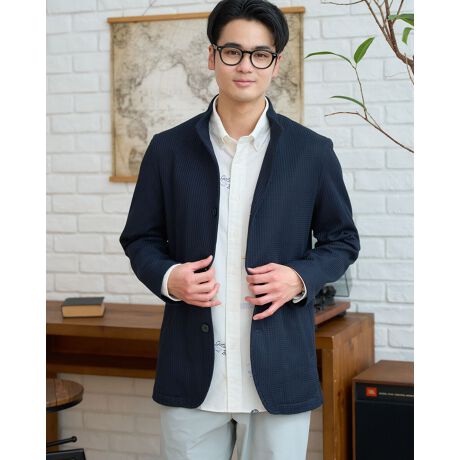 伸縮性があり快適な着心地のカットソー素材ジャケットです。