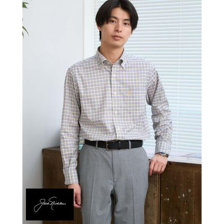 涼感ある白場チェックのボタンダウン襟シャツです。