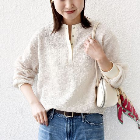 ヘンリーネックとクルーネック、前後2WAYで着まわせるプルオーバーです。