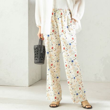 品よく決まるボタニカル柄のリバティプリントイージーパンツ。