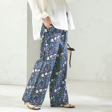 品よく決まるボタニカル柄のリバティプリントイージーパンツ。