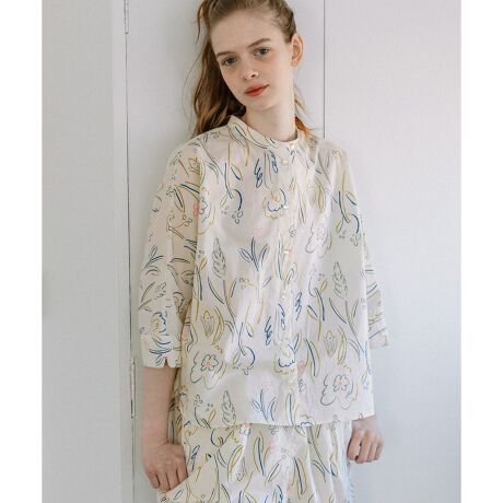 多色使いの線画の花を踊るように配置したオリジナルのプリントテキスタイルブラウス。華やかな色合いで春夏の装いにぴったりです。滑らかな表面感のコットンブロード素材を使用しています。すっきり見えするスタンドカラーに身頃続きのドルマンシルエットがリラックス感。ころんとしたキャンディのようなボタンもポイントです。