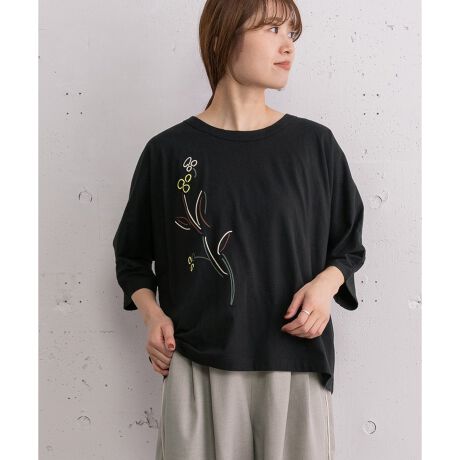 身頃続きの袖でゆったりとしたサイズ感のドルマンスリーブトップス。滑らかな綿素材を使用しています。踊るような手描きのフラワーモチーフを4色カラーで刺繍しました。長すぎない着丈で、ゆったりしたパンツやロングスカートとも相性良く着て頂けます。
