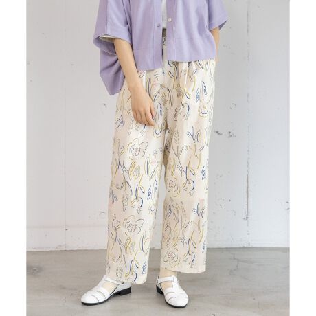 多色使いの線画の花を踊るように配置したオリジナルのプリントテキスタイルパンツ。華やかな色合いで春夏の装いにぴったり。滑らかな表面感のコットンブロード素材を使用しています。タックギャザーでふんわりしたシルエットでコーディネートに花を添えてくれます。ウエストはぐるりゴム、紐でサイズ感の調節が可能です。両サイドポケットつき。