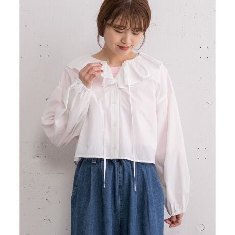 大胆なラッフルカラーが目を惹くブラウス。潔いクロップド丈が新鮮でバランスよく着用できます。ふんわりとしたギャザースリーブで袖口はゴムの仕様でまくりやすくしました。首元のリボンは結んでも垂らしてもお好みで。羽織としても使えます。