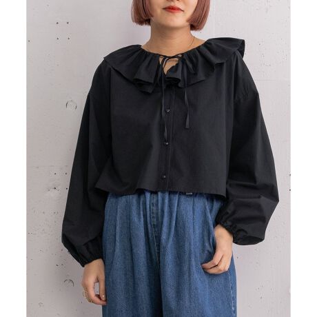 大胆なラッフルカラーが目を惹くブラウス。潔いクロップド丈が新鮮でバランスよく着用できます。ふんわりとしたギャザースリーブで袖口はゴムの仕様でまくりやすくしました。首元のリボンは結んでも垂らしてもお好みで。羽織としても使えます。