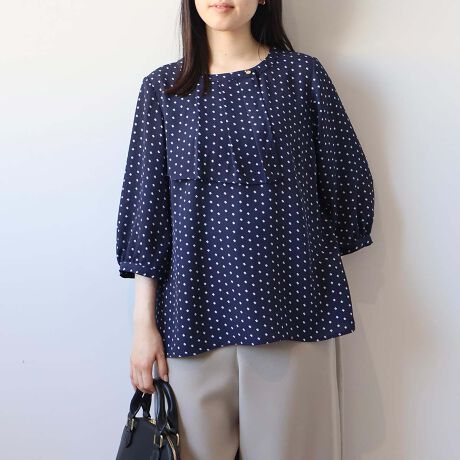 スカートと合わせ、ブラウスをアウトで着用いただくと、7分袖と落ち感のある素材が、スカートのボリュームとバランスを取り、上品な大人フェミニンスタイルが楽しめます。