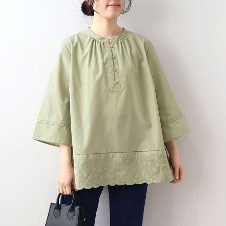 裾のスカラップ刺繍が主役。一枚で着映える、大人のチュニックブラウス