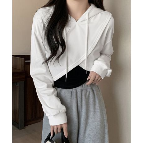 ショート丈フーディとインナーを組み合わせた、レイヤード2点セットトップス。