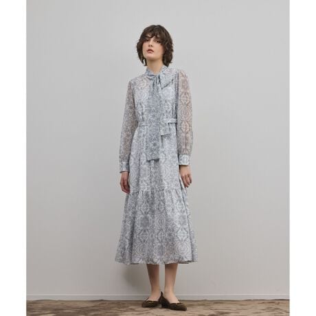 [型番:0126135224]デシン素材にダマスク柄のプリントを施したワンピース。袖とボウタイはシフォンで透け感があり、裾のティアードと衿のボウタイが華やかなデザイン。※こちらのモデル着用画像はサンプル品を撮影しております。実際の商品と仕様、加工、サイズが若干異なる場合がございます。予めご了承くださいませ。