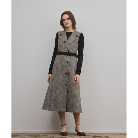 [型番:0326131343]麻調見えのざっくりとしたライトツイード素材。 レイヤードスタイルもできるシャープな印象のジャンパースカート。※こちらのモデル着用画像はサンプル品を撮影しております。実際の商品と仕様、加工、サイズが若干異なる場合がございます。予めご了承くださいませ。