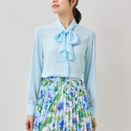 上品なシボ感のあるジョーゼット生地で仕立てられた長袖ブラウス。胸元の華やかなアクセントに映える、ふんわりとしたラッフルボウタイがポイント。結び方によってアレンジも楽しむことができます。無地のシンプルなデザインで合わせるシーンやテイストを問わず、フォーマルやオケージョンにも活躍してくれる、スタイリングの頼れる味方です。