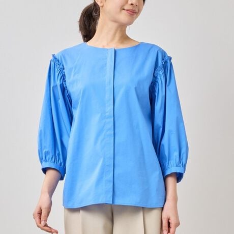 [型番:30-61-02-714]袖にデザイン性を持たせた、七分袖のプルオーバーブラウス。ほどよく張りのある生地を使用し、春夏に一枚で着映えする白シャツをイメージしています。肩の位置をやや落とし、小さなギャザーと控えめなフリルをあしらうことで、甘さを抑えた上品な表情に。パンツにもスカートにも合わせやすく、デイリーからきれいめまで幅広く活躍します。・多少透け感あり・ストレッチあり・カラー展開はホワイト、ブルー・サイズ展開は1(M)9号・3(2L)13号