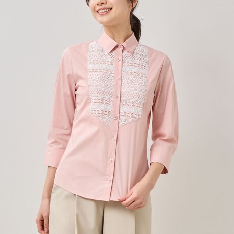 平織の綿ストレッチ生地にレースを組み合わせた、七分袖シャツ。伸縮性のある素材で着心地が良く、レースをプラスすることで程よい華やかさを演出します。ダスティピンクと白のレース使いにより、白一色とは異なる柔らかく可愛らしい印象に仕上げました。前身頃にブサムデザインのレースをあしらい、クラシックな雰囲気を女性らしく表現。きれいめにもカジュアルにも取り入れやすい一着です。