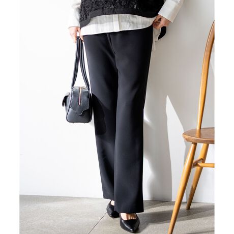 裾に向かって緩やかに広がるフレアシルエットが、トレンド感のある着こなしを演出するパンツです。腰回りはすっきりとさせつつ、膝下からの程よい広がりが、全体のバランスをきれいに整えます。オーバーサイズのニットや長めの丈のブラウスなど、ボリュームのあるトップスとも相性抜群です。ストレッチの効いた素材感で動きやすく、オフィスワークから休日のお出かけまで幅広いシーンで活躍します。カラーは、シックで万能なブラック(#005)と、ナチュラルで上品なベージュ(#033)の2色展開です。