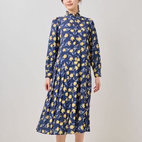 [型番:30-61-54-523]定番シルエットのプリーツドッキングワンピース。春らしいチューリップ柄はオリジナルプリントで、濃色ベースと手描きタッチにこだわることで、華やかさの中にも落ち着いた印象を演出します。プリーツの揺れが動きを添え、一枚で着映えするデザイン。付属のリボンでアレンジも楽しめ、きれいめからお出かけまで幅広く活躍します。・透け感なし・ストレッチなし・付属 ペチコート・カラー展開はブラック、ネイビー・サイズ展開は1(M)9号・3(2L)13号