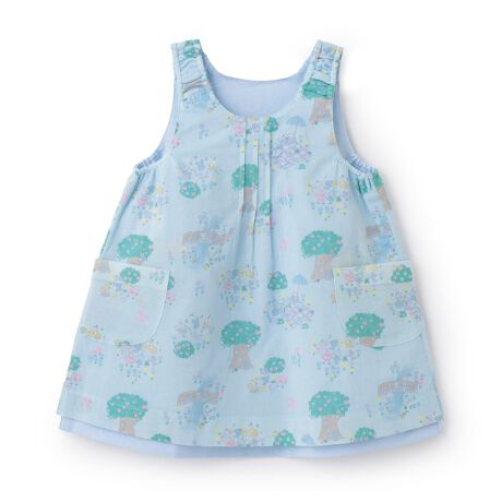 シャンブレーとローン素材総柄プリントを組み合わせた、リバーシブル仕様のジャンパースカート。ローン素材は、mimiちゃんと森の動物たちがピクニックを楽しむ様子の楽しい総柄プリント。シャンブレー側は、スカラップで縁取った大きなポケットから、アップリケされたmimiちゃんや刺しゅうの仲間たちが出ている仕様です。両サイド、その日の気分に合わせて楽しめます。薄手の春夏素材どうしの組み合わせなので、リバーシブルでもやわらかく、軽い着心地です。