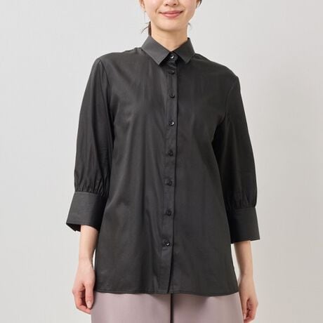 [型番:30-61-02-713]薄手の綿ローン素材を使用した、七分袖のビッグシルエットシャツ。やわらかな生地感とふんわりとした袖のボリュームが、リラックス感のある印象を演出します。ダークトーンのカラー展開ながら、軽やかで抜け感のある仕上がりが魅力。初夏には羽織りとしても取り入れやすく、パンツにもスカートにも合わせやすい一着です。・カラー展開は、ブラック、ブルー・サイズ展開は1(M)9号・3(2L)13号