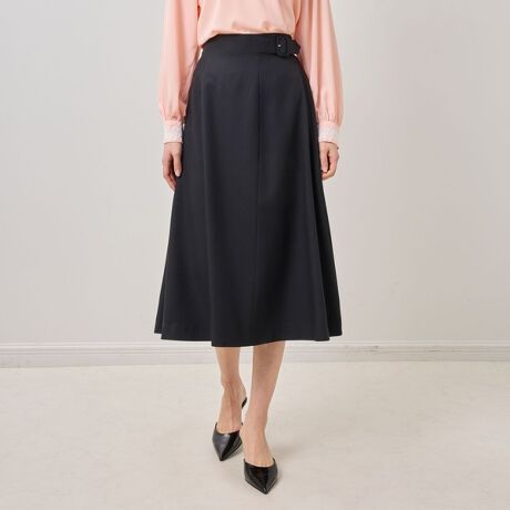 ウエストにバックルデザインを施した、巻きスカート風のフレアスカート。ツイルストレッチ素材を贅沢に使用し、歩くたびに美しく揺れるシルエットに仕上げています。ウエスト位置をやや高めに設定し、着丈も長すぎないバランスに整えることで、スタイルアップ効果も期待できます。トップスを選ばず幅広いコーディネートに取り入れやすい一着です。