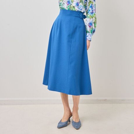 ウエストにバックルデザインを施した、巻きスカート風のフレアスカート。ツイルストレッチ素材を贅沢に使用し、歩くたびに美しく揺れるシルエットに仕上げています。ウエスト位置をやや高めに設定し、着丈も長すぎないバランスに整えることで、スタイルアップ効果も期待できます。トップスを選ばず幅広いコーディネートに取り入れやすい一着です。
