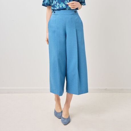 ウエスト両脇にボタンをあしらった、抜け感のある八分丈ワイドパンツ。センタープレスに大きめのタックを入れ、ウエストから腰まわりでタックをたたむことで、すっきりとした印象とゆとりのあるシルエットを両立しています。後ろウエストはゴム仕様で、股上もやや深めに設定し、快適な穿き心地を実現。きれいめにもカジュアルにも取り入れやすい一本です。