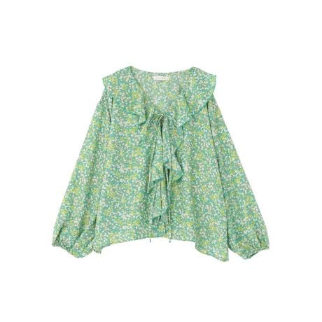 花柄とフリルで叶える上品カジュアル繊細な花柄が大人の可愛らしさを引き立て、普段の装いにさりげない華やかさをプラスします。首元から流れるフリルデザインが顔周りを明るく見せ、写真映えも期待できます。軽やかな素材感で重ね着しやすく、季節の変わり目にも取り入れやすいのが魅力です。リボンを結べばフェミニンに、ほどけば抜け感のある印象になり、その日の気分で着こなしを調整できます。パンツにもスカートにも合わせやすく、毎日のコーディネートを簡単に格上げしてくれます。透け感[ややあり]