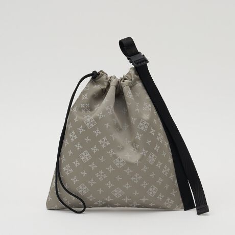 ナイロンジャガードの素材感を活かしつつ、テープ使いで程よくエッジを効かせた巾着ポーチ。