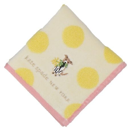 国際女性デーに向けたミモザのイエローをベースにした犬モチーフのドット柄のタオルハンカチ。ご自分用にはもちろん、ちょっとした贈り物にもおすすめです。