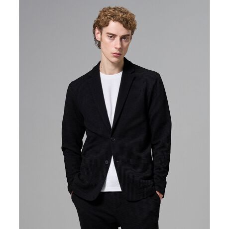ベーシックな2ボタンのテーラードカットソージャケットで1枚生地の素材を活かしたミニマルなデザイン。