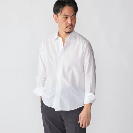 襟型は汎用性の高いワイドカラーとなっており、休日からビジネスカジュアルまで幅広くお使いいただけます。
