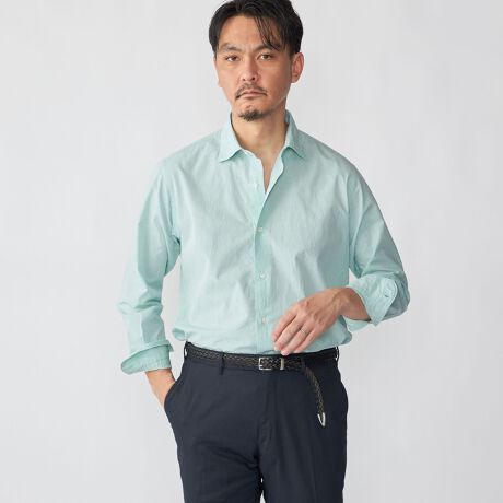 襟型は汎用性の高いワイドカラーとなっており、休日からビジネスカジュアルまで幅広くお使いいただけます。