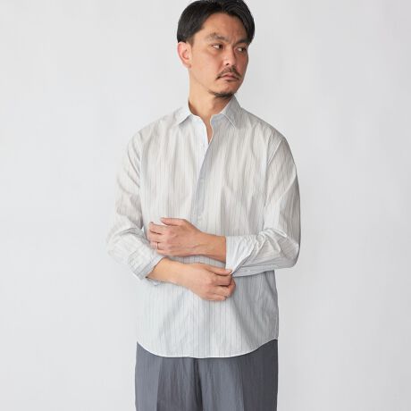 襟型は汎用性の高いワイドカラーとなっており、休日からビジネスカジュアルまで幅広くお使いいただけます。