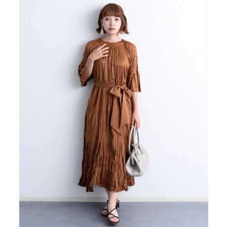 ストン!と1枚でスタイルが決まるロングワンピースに、シックで高級感のあるサテンプリーツが上品な一着