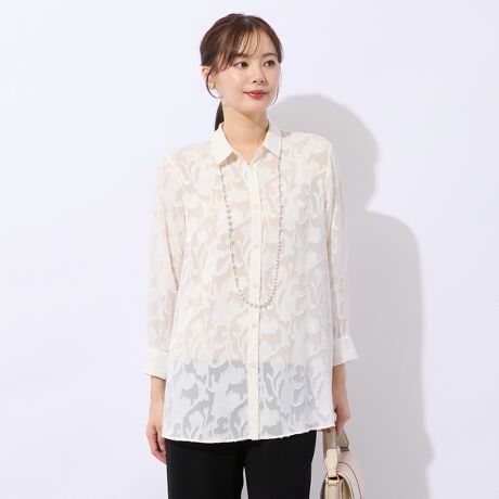 花柄を凹凸感のあるカットジャカードで表現したシアー感のあるブラウス。軽やかでシアー感のある素材が涼しげ。陰影感があり上品で女性らしさのあるブラウスです。