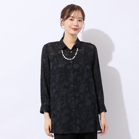 花柄を凹凸感のあるカットジャカードで表現したシアー感のあるブラウス。軽やかでシアー感のある素材が涼しげ。陰影感があり上品で女性らしさのあるブラウスです。
