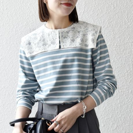 マリンボーダーにレースのセーラーカラーをあしらった、存在感のあるロングTシャツ。