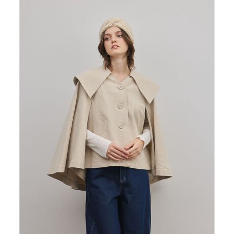 [型番:0126101120]リネン高混率のオックス素材を使用したケープジャケット。大きめの衿が華やかな印象。リボン付レースカラーと合わせて着用を推奨。※こちらのモデル着用画像はサンプル品を撮影しております。実際の商品と仕様、加工、サイズが若干異なる場合がございます。予めご了承くださいませ。