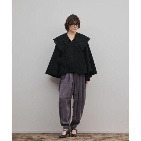 [型番:0126101120]リネン高混率のオックス素材を使用したケープジャケット。大きめの衿が華やかな印象。リボン付レースカラーと合わせて着用を推奨。※こちらのモデル着用画像はサンプル品を撮影しております。実際の商品と仕様、加工、サイズが若干異なる場合がございます。予めご了承くださいませ。